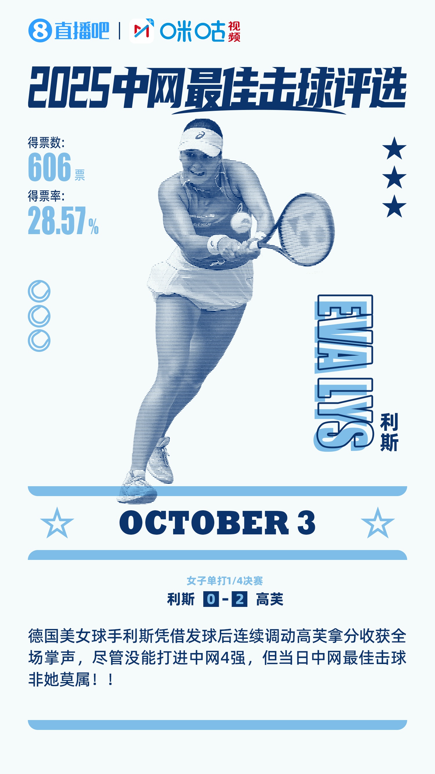 在10月3日的投票中,利斯凭借其极具技巧的发球,成功调动了高芙,最终赢得了28.57%的吧友们的支持,光荣当选为当日的#中网最佳击球#。这一精彩的时刻不禁让观众们为之欢呼,展示了顶尖选手的风采与实力。