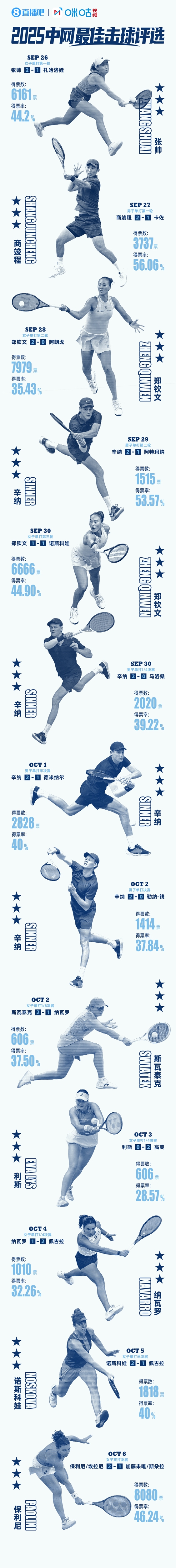 进入第二轮,女单的Queen文以一颗精准无比的正手球取得最佳击球。而在男单方面,辛纳展现了其卓越的技术,他的反拍斜线让人叹为观止,赢得了这一轮的最佳击球称号。