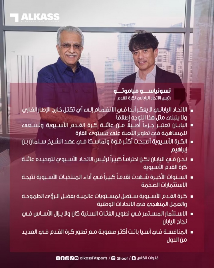 与此同时,日本足协主席宫本恒靖也对此事作出了明确回应。他指出:“日本足协从未有过此类想法,我们不会加入或创办其他足球联盟。在现任亚足联主席的领导下,我们有信心亚洲足球将会日益壮大,球队间的团结也会加强。”