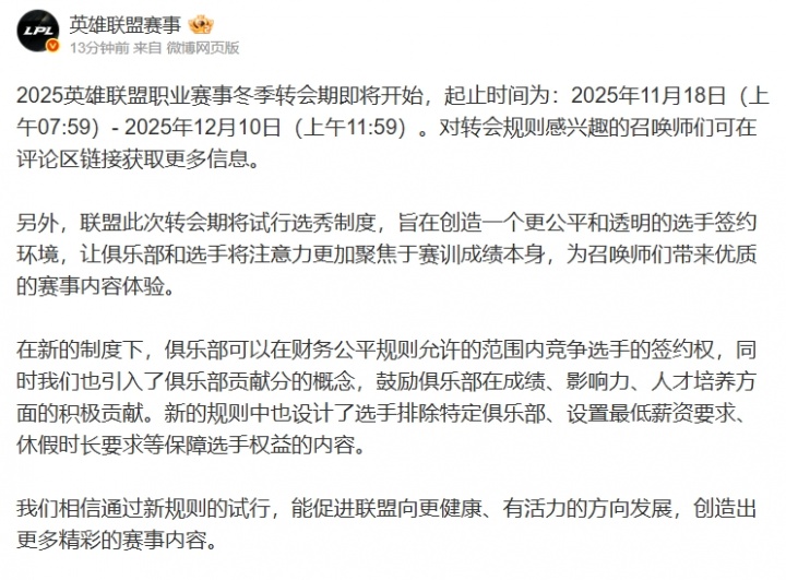 11月17日,LPL赛事官方在社交媒体上发公告,正式揭晓了一套全新的转会规则,呼唤各位召唤师们做好准备,转会季即将到来!让我们来看看这个万众期待的“盛会”究竟有什么新招儿。