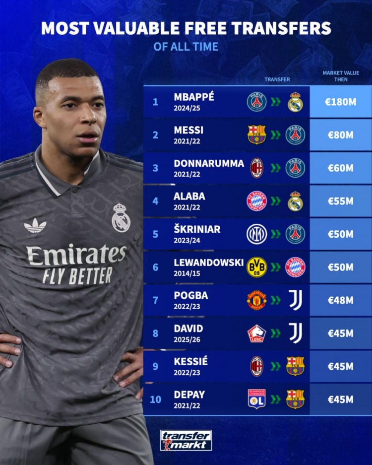 在这份榜单中,曼联的博格巴以4800万欧元的身价位列第七,他选择自由转会至尤文图斯。而里尔的戴维则以4500万欧元的身价同样转会至尤文,意大利的凯西也以同样的身价从米兰转会至巴萨。最后,来自里昂的德佩同样以4500万欧元的身价加盟巴萨。