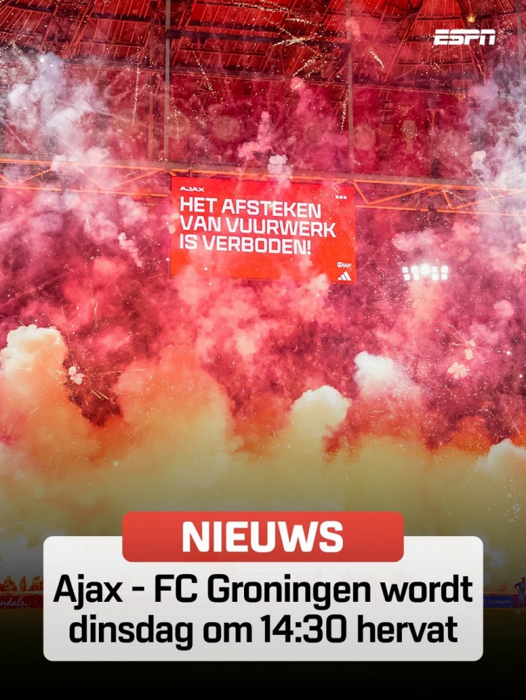 12月1日,阿贾克斯与格罗宁根的荷甲联赛因为球迷燃放烟花而中断,最终宣布取消。为了尽快解决这一情况,阿贾克斯俱乐部和荷兰足协做出了相关更新,补赛将定于北京时间周二晚上21:30在闭门的情况下进行。