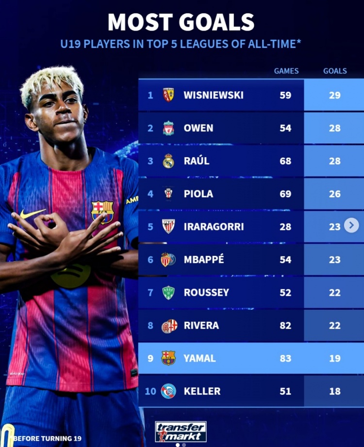 12月2日讯 巴萨目前在本赛季西甲中稳居积分榜首位。年轻球员亚马尔在赛季中表现抢眼,至今参加14场比赛贡献了7个进球和8次助攻,其中在西甲联赛中出战的10场中打入5球并送出7次助攻。这一出色的表现使他在五大联赛的历史U19进球榜上跻身前十。