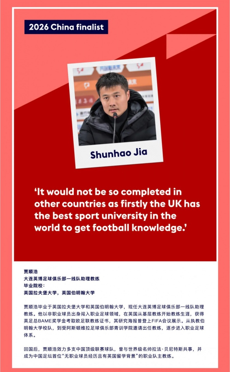 在即将揭晓的“2026英国杰出校友大奖”中,贾顺浩的名字赫然在列,特地为“文化、创意与体育奖”这一殊荣而生。在12月6日的盛典上,我们拭目以待,看看这个从英格兰土壤上成长起来的教练,能否收获他的心愿。