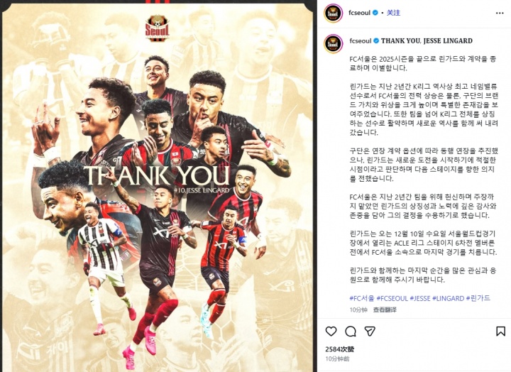 俱乐部的声明指出,林加德在过去两个赛季中,作为K联赛商业价值最高的球员,不仅为首尔FC的战斗力做出了重大贡献,还极大提升了俱乐部的品牌价值和行业地位。他的影响力甚至超出了球队的范围,成为了整个K联赛的标志性人物,并与联赛一同书写了新的历史篇章。