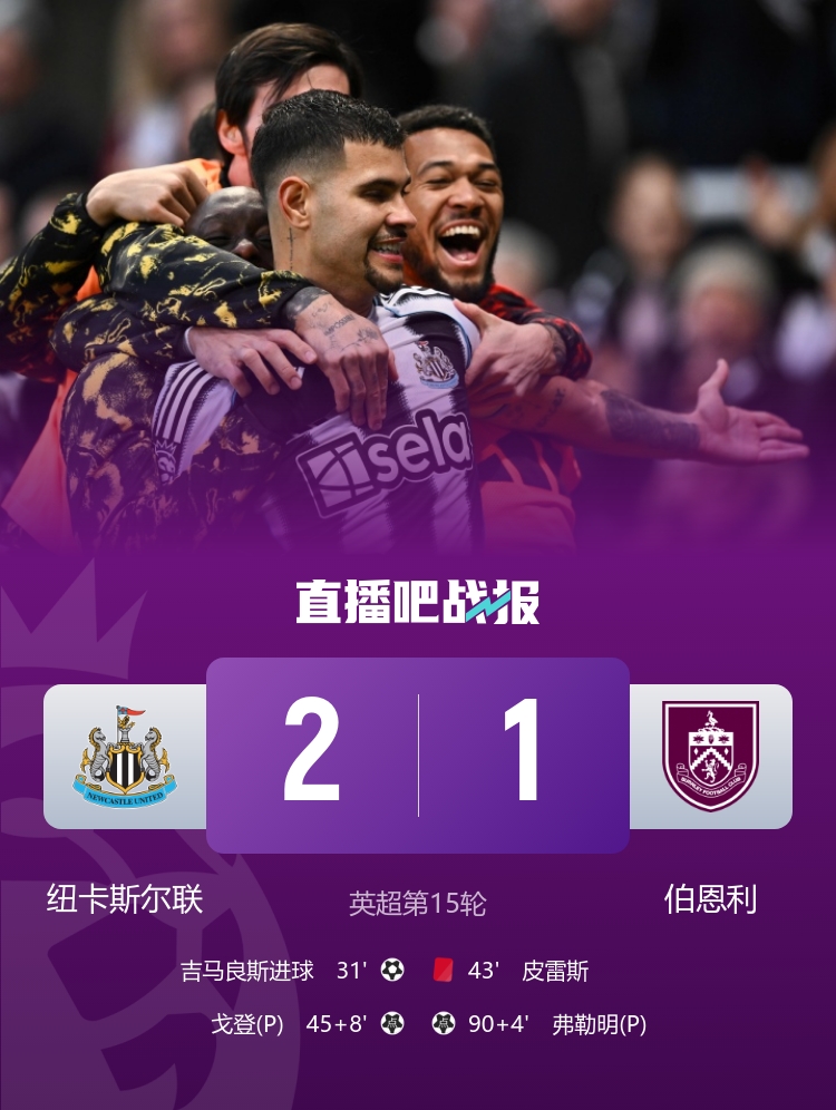 下半场进入补时阶段,战局风云突变,第45+6分钟,伯恩利禁区内出现手球,主裁在观看VAR后示意罚点球。戈登毫不犹豫,稳稳将球罚入,为纽卡斯尔再添一分,比分变为2-0。虽然形势看似对伯恩利愈发不利,但在第90+4分钟时,雅各布·拉姆塞因手球送给伯恩利一次点球机会,弗勒明镇定自若,将球送入网窝,让比赛的悬念重燃,最终比分定格在2-1。
