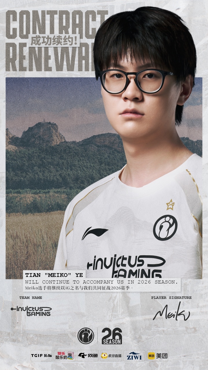 时间的流逝无声却深刻,而大自然的神秘语境隐含着长青的哲理。我们满怀欣喜,新赛季能够与Meiko这样的选手并肩作战。感谢每一位支持Meiko与iG的粉丝,正是你们的热情与关注铸就了这个团队的力量。愿未来的征途如同长风般相伴,让每一步都向着丰饶而去,每一次出征都能迎向星辰大海。