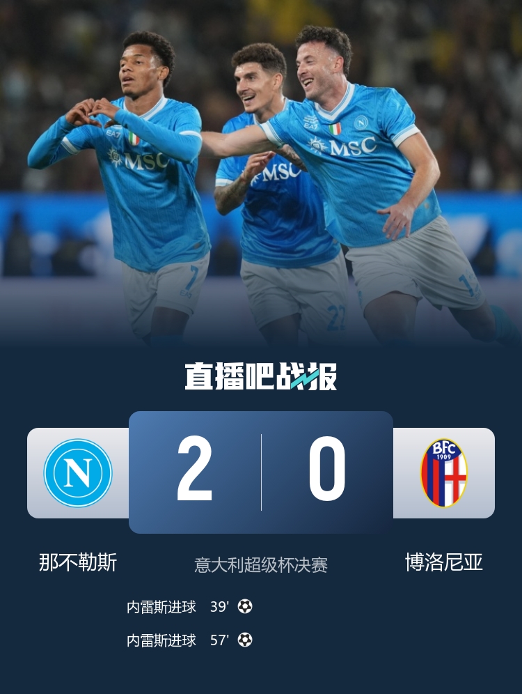 在12月23日的意大利超级杯决赛中,那不勒斯迎战博洛尼亚,比赛在沙特国王大学体育场举行。经过90分钟的较量,那不勒斯以2-0战胜博洛尼亚,成功夺得俱乐部历史上的第三座意超杯奖杯。