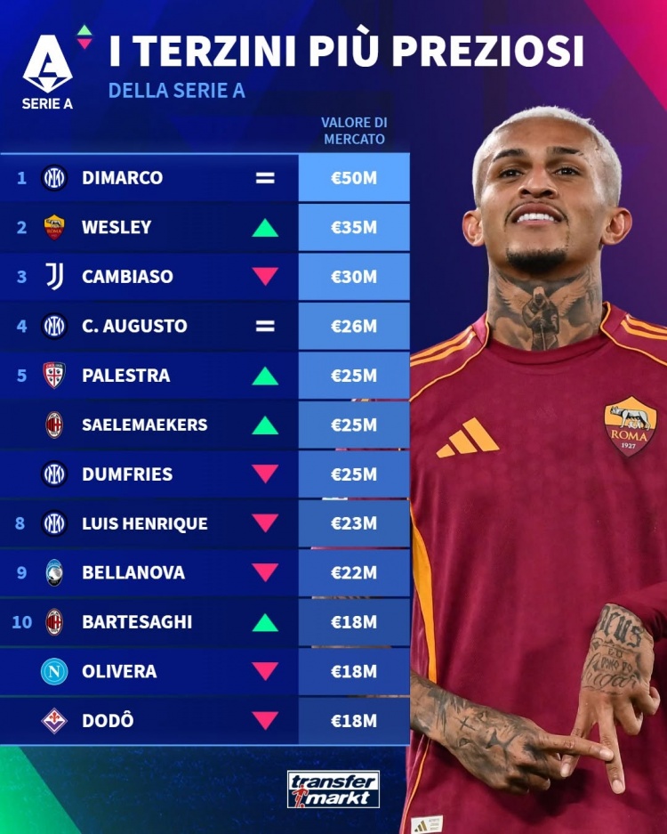 12月25日讯 最近,德国转会市场更新了意甲球员的身价。在这份榜单中,我们看到了意甲边后卫的最新身价TOP10。排名第一的是国米的迪马尔科,他的身价依然稳固在5000万欧元。而罗马的右后卫韦斯利则以3500万欧元的身价跃升至第二,超越了尤文的坎比亚索,后者目前身价为3000万欧元。