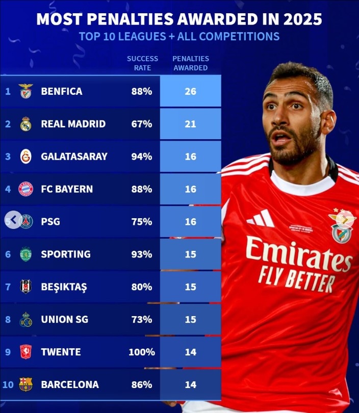 2025年俱乐部点球排行:本菲卡领衔获26个,皇马21个,巴萨14个_德甲直播