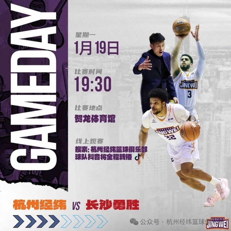 请锁定杭州经纬篮球俱乐部直播间,关注1月19日19:30的比赛!