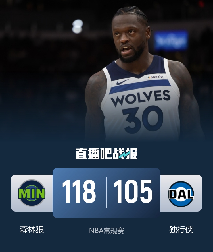 比赛结束,森林狼以118-105的比分在客场战胜独行侠,收获胜利。