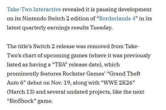 2月4日的消息显示,Take-Two在2026财年第三季度的财报中确认了一个重要决定:他们暂停了《无主之地4》Switch 2版本的开发。原计划于2025年10月3日发布的这一版本,现在已经被移出了公司的“即将推出”游戏列表。