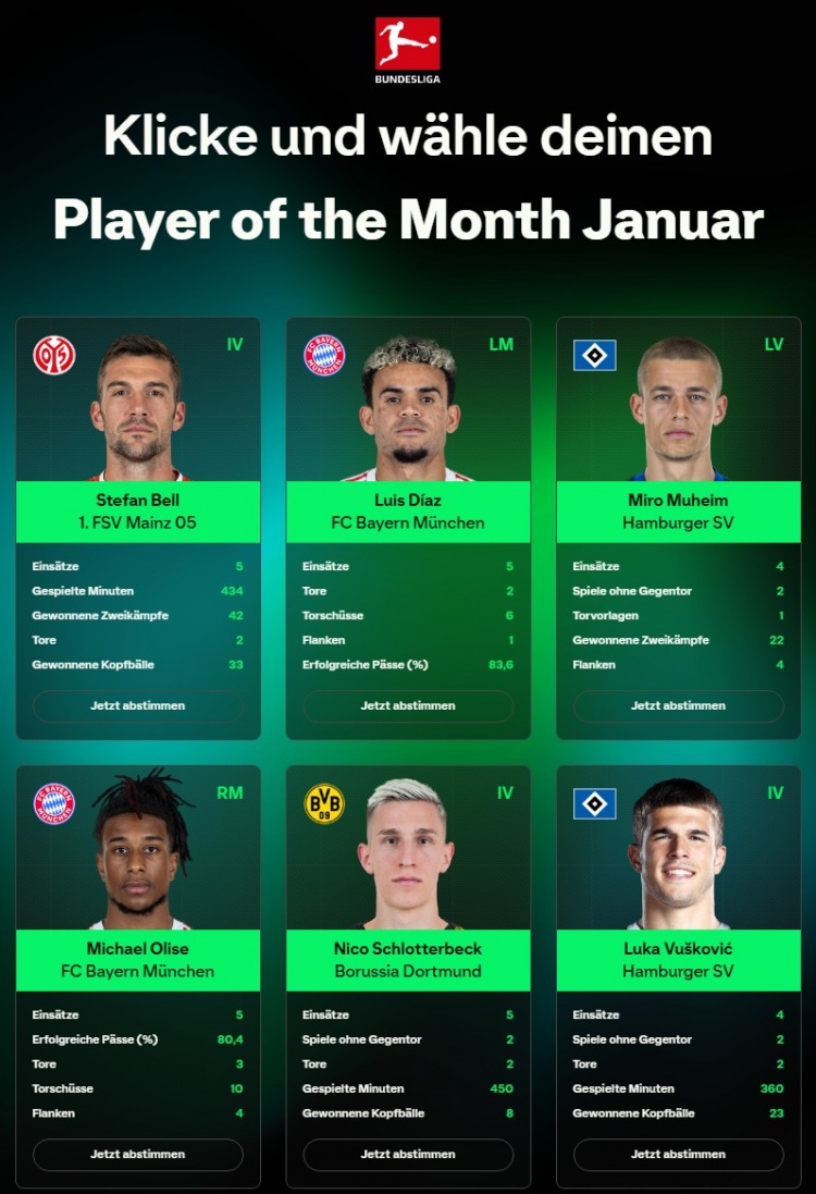 2月5日讯 德甲一月最佳球员候选名单正式公布,众多球员表现突出,其中奥利塞、路易斯·迪亚斯和武什科维奇备受瞩目。