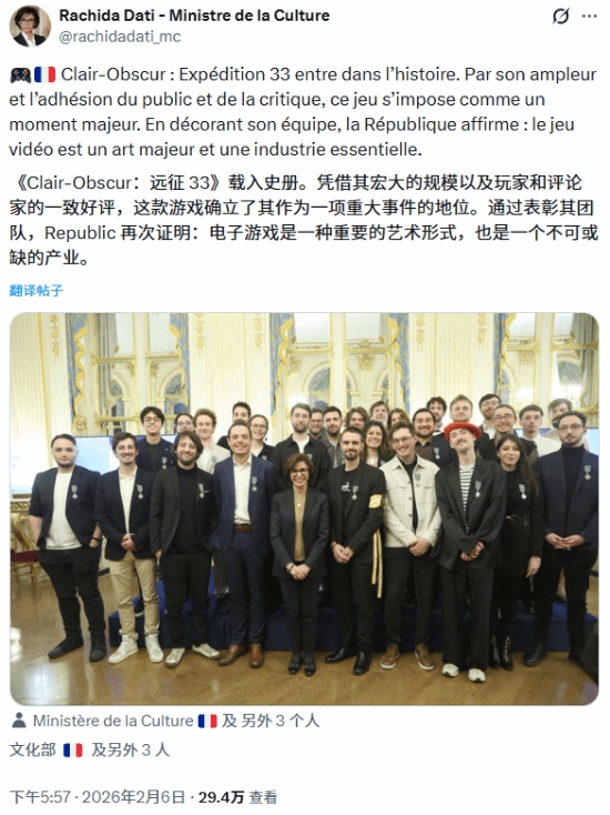 法国文化部长拉希达·达蒂近日宣布,游戏开发公司Sandfall Interactive因其畅销游戏《光与影:33号远征队》获得法国文化部颁发的艺术与文学勋章。这一荣誉的官方发布在达蒂的社交媒体账号上引起了广泛关注,她指出,这款游戏的成功充分证明了电子游戏作为一种重要艺术形式的地位,以及其作为产业的必要性。