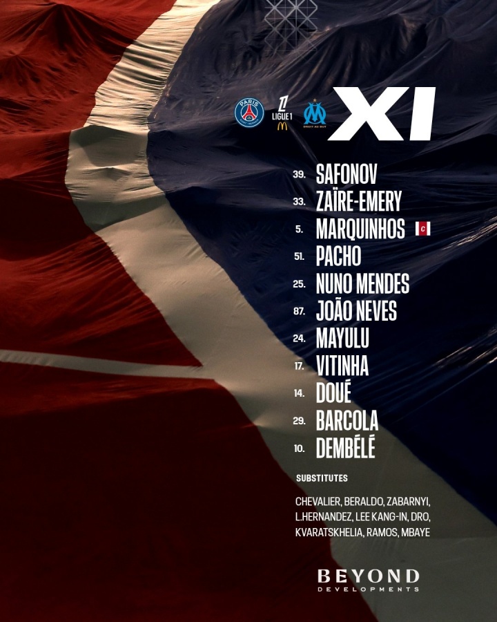 对于替补阵容来说,舍瓦利耶、贝拉尔多、扎巴尔尼、卢卡斯、李刚仁、德罗、克瓦拉茨赫利亚、贡萨洛·拉莫斯和姆巴耶一同待命,他们都具备出场后的强大冲击力,随时准备登场为球队提供支持。