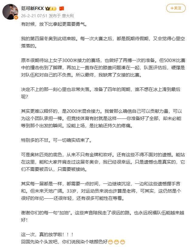 在赛后的时刻,33岁的老将范可新在社交媒体上回顾了自己的这一奥运之旅。她感慨道,有时候,放下比追求更需要勇气与决心。随着她的第四届冬奥会告一段落,复杂的情感交织着期待和失落,她坦言,假期的来临固然让人愉悦,但心里的空洞感同样难以忽视。