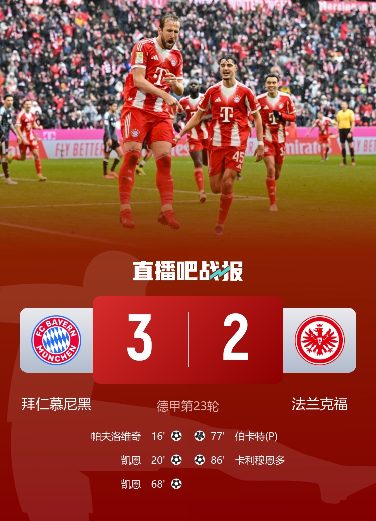 下半场进行到第68分钟,拜仁如猛虎下山,基米希在调整脚步后,助凯恩打出一记精彩的远射,比分被扩大至3-0。然而,法兰克福并未就此放弃。第75分钟,凯恩禁区内的犯规使法兰克福获得了点球机会,伯卡特稳稳命中,助队缩小比分到3-1。紧接着在第86分钟,法兰克福抓住拜仁防线的失误,由卡利姆恩多再下一城,将比分改写为3-2,比赛也因此变得更加紧张。