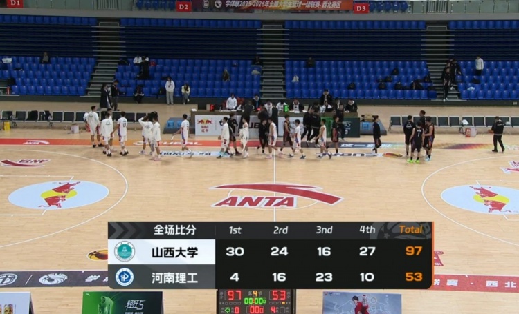 比赛开局,山西大学在攻防两端全面占优,乃木达状态火热,他单节砍下四记三分球,山西大学打出了一波30-2的攻势,迅速拉开分差。河南理工虽然由张庭尉率先取得分数,但在前9分钟内他们的得分仅靠这一次进球,第一节以4-30结束,河南理工面临严重的劣势。